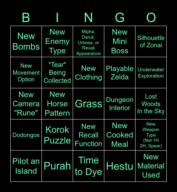 This bingo card has a free space and 24 words: Korok Puzzle, Purah, New Clothing, Pilot an Island, Silhouette of Zonai, New Bombs, New Movement Option, New Enemy Type, Dungeon Interior, New Recall Function, Playable Zelda, New Camera "Rune", New Cooked Meal, New Weapon Type (Not 1H 2H, Spear), "Tear" Being Collected, Hestu, Lost Woods In the Sky, Mipha, Daruk, Urbosa, or Revali Appearance, Underwater Exploration, New Horse Pattern, New Material Used, Dodongos, New Mini Boss and Time to Dye.