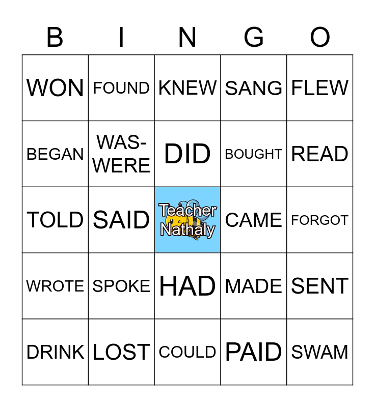 This bingo card has a free space and 39 words: ATE, WENT, SAW, WAS-WERE, DRINK, HAD, DID, SLEPT, FLEW, WROTE, SAID, SANG, SWAM, FORGOT, CAME, SPOKE, TOOK, WON, RAN, MADE, BEGAN, COULD, BOUGHT, READ, BROKE, BUILT, CHOSE, DREW, DROVE, FOUND, GOT, GAVE, KNEW, LOST, PAID, SOLD, SENT, TOLD and STOLE.