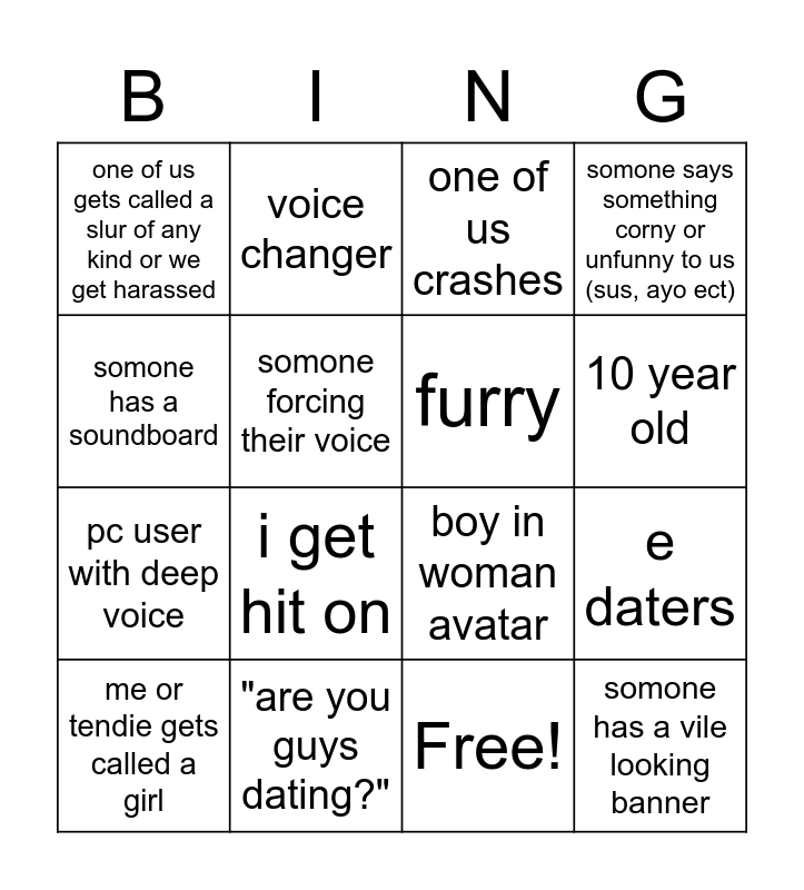 This bingo card has 17 words: Free!, me or tendie gets called a girl, one of us crashes, one of us gets called a slur of any kind or we get harassed, i get hit on, somone says something corny or unfunny to us (sus, ayo ect), e daters, furry, 10 year old, somone forcing their voice, "are you guys dating?", boy in woman avatar, somone has a soundboard, voice changer, pc user with deep voice, somone has a funny voice and somone has a vile looking banner.