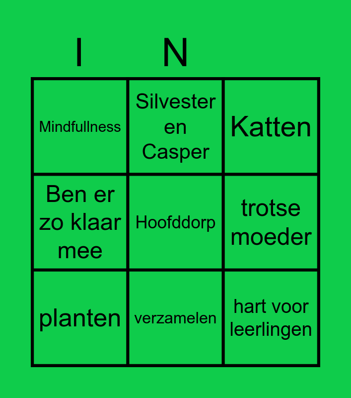 This bingo card has 9 words: planten, Katten, Silvester en Casper, Ben er zo klaar mee, Mindfullness, trotse moeder, Hoofddorp, hart voor leerlingen and verzamelen.