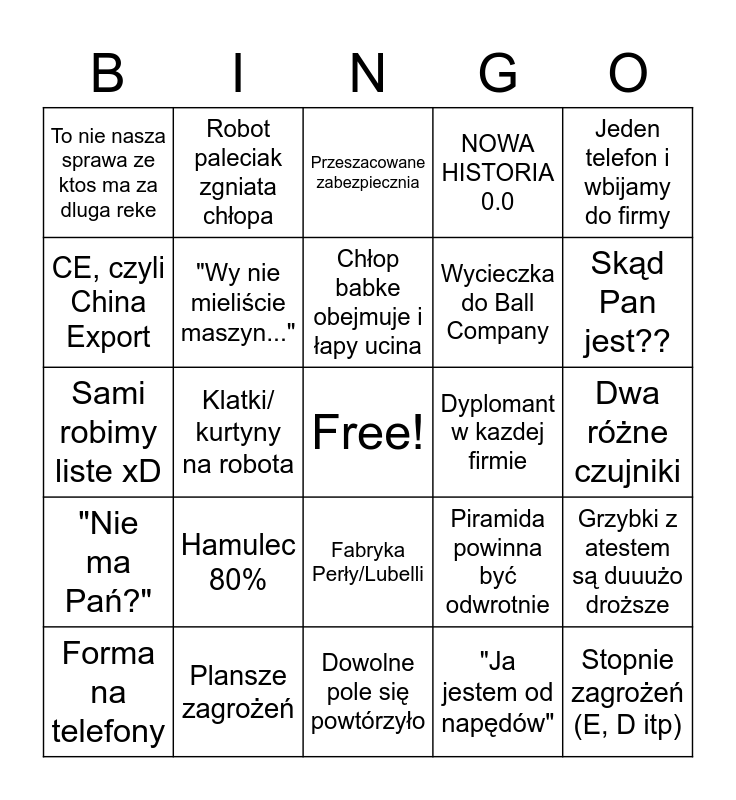 This bingo card has a free space and 24 words: Hamulec 80%, Plansze zagrożeń, Chłop babke obejmuje i łapy ucina, Forma na telefony, Jeden telefon i wbijamy do firmy, To nie nasza sprawa ze ktos ma za dluga reke, CE, czyli China Export, Robot paleciak zgniata chłopa, Dyplomant w kazdej firmie, Fabryka Perły/Lubelli, Wycieczka do Ball Company, Sami robimy liste xD, Piramida powinna być odwrotnie, Grzybki z atestem są duuużo droższe, "Wy nie mieliście maszyn...", "Ja jestem od napędów", Dwa różne czujniki, Przeszacowane zabezpiecznia, Skąd Pan jest??, Klatki/ kurtyny na robota, Stopnie zagrożeń (E, D itp), "Nie ma Pań?", NOWA HISTORIA 0.0 and Dowolne pole się powtórzyło.