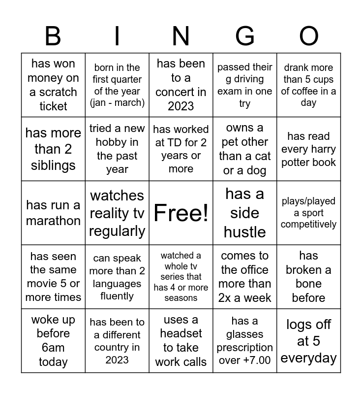This bingo card has a free space and 24 words: can speak more than 2 languages fluently, has been to a different country in 2023, has worked at TD for 2 years or more, woke up before 6am today, drank more than 5 cups of coffee in a day, has won money on a scratch ticket, has more than 2 siblings, born in the first quarter of the year (jan - march), has a side hustle, watched a whole tv series that has 4 or more seasons, owns a pet other than a cat or a dog, has run a marathon, comes to the office more than 2x a week, has broken a bone before, tried a new hobby in the past year, has a glasses prescription over +7.00, plays/played a sport competitively, has been to a concert in 2023, has read every harry potter book, watches reality tv regularly, logs off at 5 everyday, has seen the same movie 5 or more times, passed their g driving exam in one try and uses a headset to take work calls.