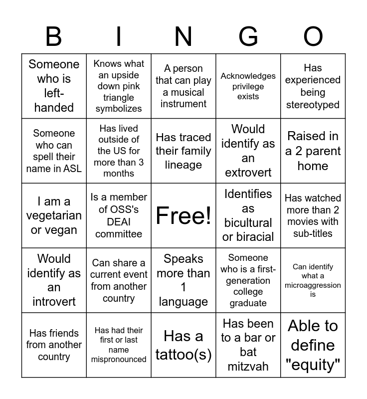 This bingo card has a free space and 24 words: Can share a current event from another country, Has had their first or last name mispronounced, Has traced their family lineage, Has friends from another country, Has experienced being stereotyped, Someone who is left-handed, Someone who can spell their name in ASL, Knows what an upside down pink triangle symbolizes, Identifies as bicultural or biracial, Speaks more than 1 language, Would identify as an extrovert, I am a vegetarian or vegan, Someone who is a first-generation college graduate, Can identify what a microaggression is, Has lived outside of the US for more than 3 months, Has been to a bar or bat mitzvah, Has watched more than 2 movies with sub-titles, A person that can play a musical instrument, Raised in a 2 parent home, Is a member of OSS's DEAI committee, Able to define "equity", Would identify as an introvert, Acknowledges privilege exists and Has a tattoo(s).