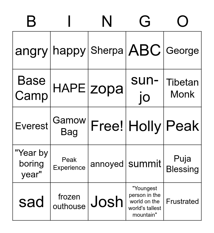 This bingo card has a free space and 24 words: Peak Experience, frozen outhouse, zopa, sad, George, angry, Base Camp, happy, Holly, annoyed, sun-jo, Everest, summit, Puja Blessing, HAPE, "Youngest person in the world on the world's tallest mountain", Peak, Sherpa, Tibetan Monk, Gamow Bag, Frustrated, "Year by boring year", ABC and Josh.