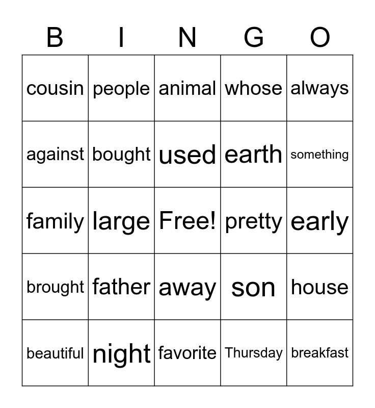 This bingo card has a free space and 34 words: piece, Thursday, Wednesday, Saturday, brought, bought, always, beautiful, people, different, used, animal, answer, again, pretty, something, night, family, father, son, away, whose, cousin, early, favorite, breakfast, whose, learn, earth, against, right, large, house and move.