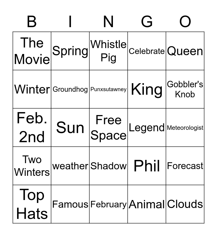 This bingo card has a free space and 24 words: weather, Famous, Punxsutawney, Top Hats, Queen, The Movie, Winter, Spring, Legend, Shadow, King, Feb. 2nd, Phil, Forecast, Groundhog, Animal, Meteorologist, Whistle Pig, Gobbler's Knob, Sun, Clouds, Two Winters, Celebrate and February.