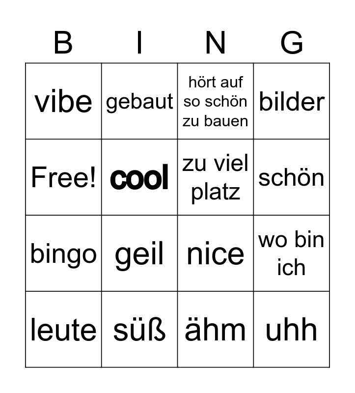 This bingo card has 16 words: süß, wo bin ich, hört auf so schön zu bauen, vibe, bingo, gebaut, nice, ähm, Free!, cool, leute, bilder, geil, schön, zu viel platz and uhh.
