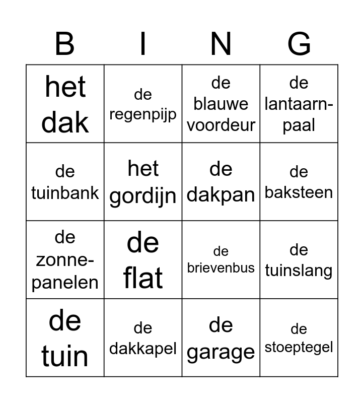 This bingo card has 16 words: de dakkapel, de tuinslang, de blauwe voordeur, het dak, de zonne-panelen, de regenpijp, de brievenbus, de garage, de tuinbank, het gordijn, de tuin, de lantaarn-paal, de flat, de baksteen, de dakpan and de stoeptegel.