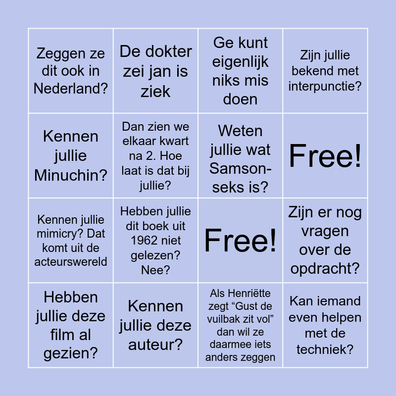 This bingo card has 16 words: Kennen jullie deze auteur?, Zijn er nog vragen over de opdracht?, Ge kunt eigenlijk niks mis doen, Zeggen ze dit ook in Nederland?, Kennen jullie mimicry? Dat komt uit de acteurswereld, De dokter zei jan is ziek, Free!, Als Henriëtte zegt “Gust de vuilbak zit vol” dan wil ze daarmee iets anders zeggen, Kennen jullie Minuchin?, Dan zien we elkaar kwart na 2. Hoe laat is dat bij jullie?, Hebben jullie deze film al gezien?, Zijn jullie bekend met interpunctie?, Hebben jullie dit boek uit 1962 niet gelezen? Nee?, Free!, Weten jullie wat Samson-seks is? and Kan iemand even helpen met de techniek?.