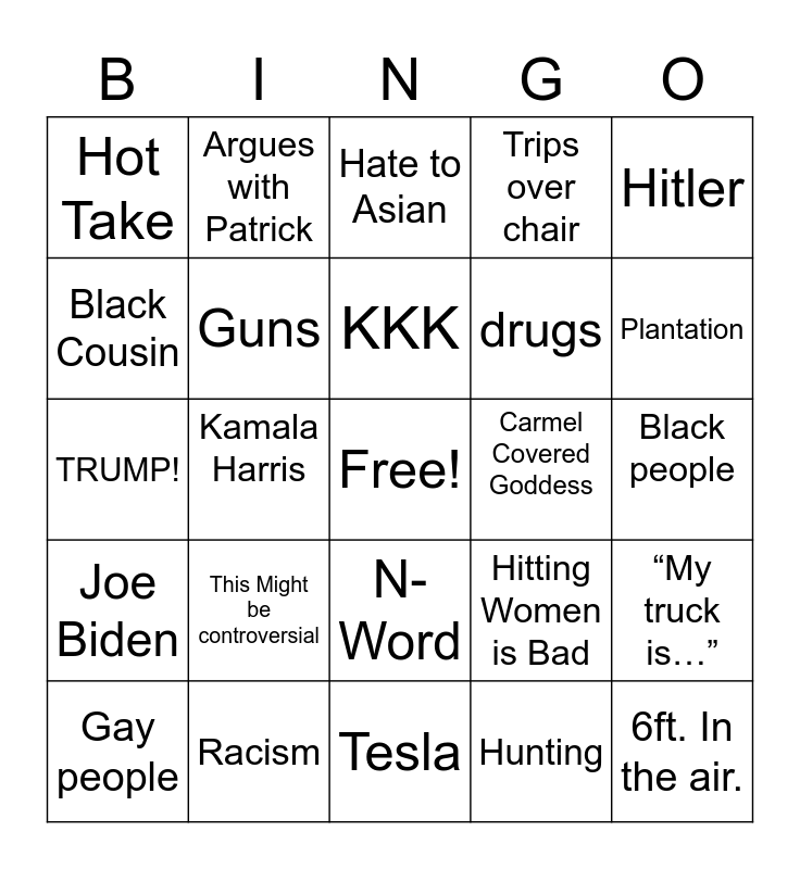This bingo card has a free space and 29 words: Gay people, Gonna be Honest, Kamala Harris, Trucks, Hot Take, Hate to Asian, Guns, This Might be controversial, Carmel Covered Goddess, Racism, Black people, 6ft. In the air., Tesla, Hunting, Plantation, Dad Stance, N-Word, Joe Biden, Hitler, TRUMP!, Hitting Women is Bad, Shut Up!, drugs, Black Cousin, Trips over chair, Argues with Patrick, “My truck is…”, KKK and Sister hating him.