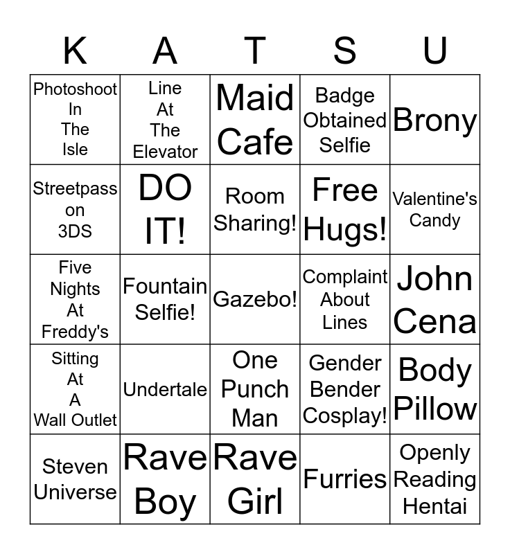 This bingo card has a free space and 24 words: Undertale, Rave Boy, Room Sharing!, Steven Universe, Brony, Photoshoot In The Isle, Streetpass on 3DS, Line At The Elevator, Complaint About Lines, One Punch Man, Free Hugs!, Five Nights At Freddy's, Gender Bender Cosplay!, Body Pillow, DO IT!, Furries, John Cena, Maid Cafe, Valentine's Candy, Fountain Selfie!, Openly Reading Hentai, Sitting At A Wall Outlet, Badge Obtained Selfie and Rave Girl.