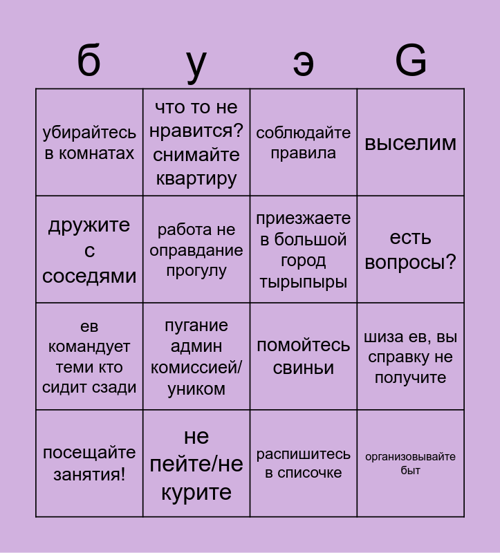 This bingo card has 16 words: не пейте/не курите, шиза ев, вы справку не получите, соблюдайте правила, убирайтесь в комнатах, ев командует теми кто сидит сзади, что то не нравится? снимайте квартиру, помойтесь свиньи, распишитесь в списочке, дружите с соседями, работа не оправдание прогулу, посещайте занятия!, выселим, пугание админ комиссией/уником, есть вопросы?, приезжаете в большой город тырыпыры and организовывайте быт.