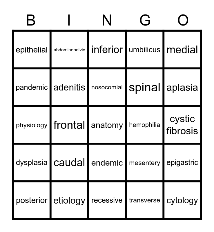 This bingo card has a free space and 24 words: caudal, etiology, nosocomial, posterior, medial, epithelial, pandemic, abdominopelvic, hemophilia, endemic, spinal, physiology, mesentery, epigastric, adenitis, transverse, cystic fibrosis, inferior, aplasia, frontal, cytology, dysplasia, umbilicus and recessive.