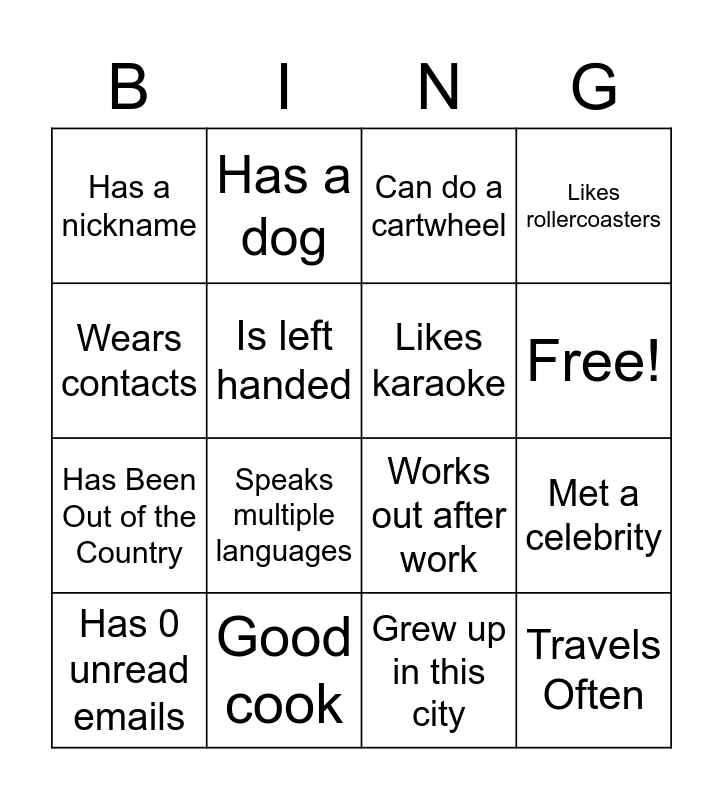 This bingo card has 17 words: Grew up in this city, Has 0 unread emails, Can do a cartwheel, Has a nickname, Speaks multiple languages, Likes rollercoasters, Met a celebrity, Likes karaoke, Free!, Is left handed, Good cook, Works out after work, Wears contacts, Has a dog, Has Been Out of the Country, Broken A Bone and Travels Often.