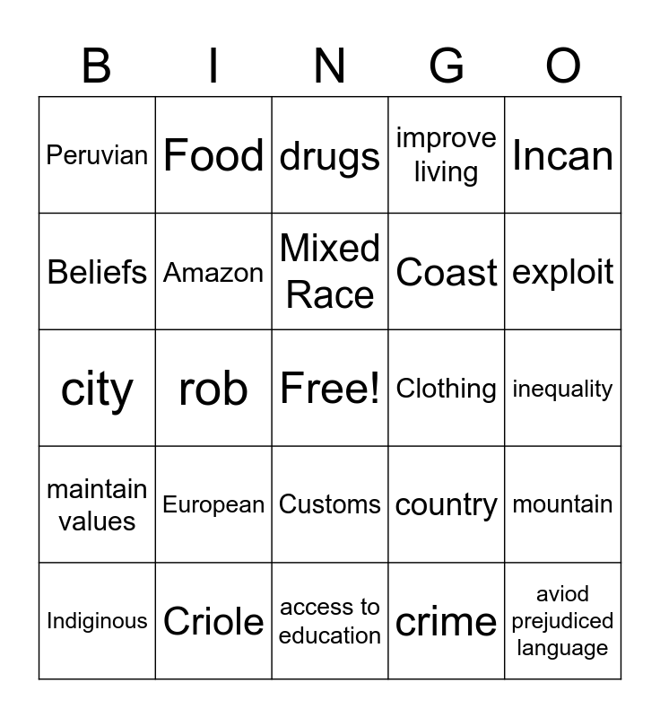 This bingo card has a free space and 24 words: European, Criole, Mixed Race, Indiginous, Incan, Peruvian, Beliefs, Food, Clothing, Customs, Coast, city, country, mountain, Amazon, crime, inequality, drugs, exploit, rob, aviod prejudiced language, maintain values, improve living and access to education.