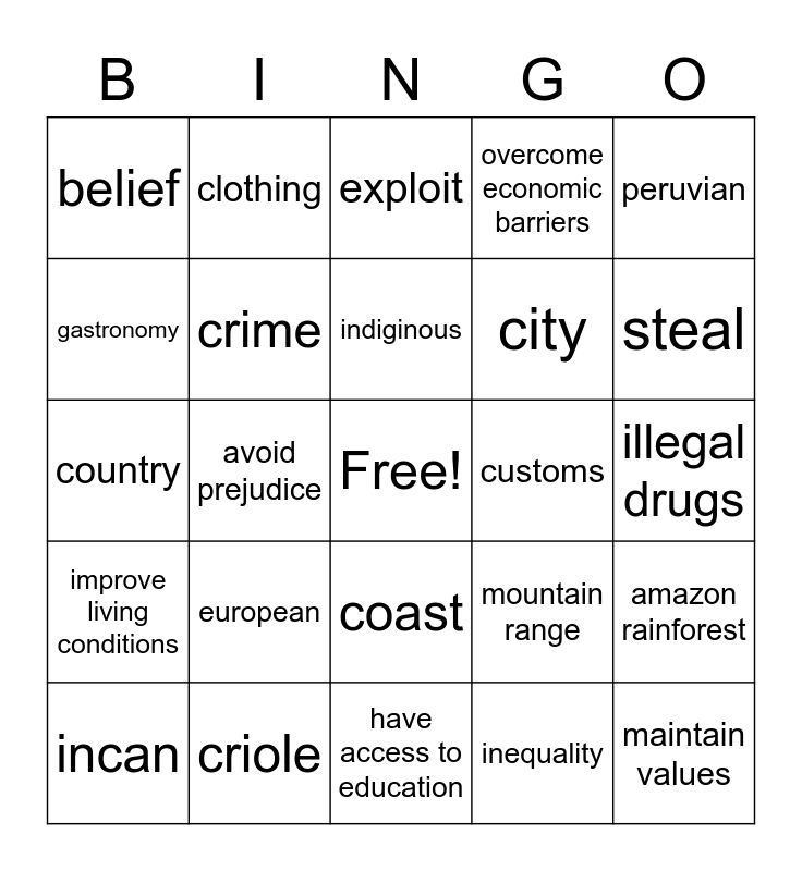 This bingo card has a free space and 24 words: european, criole, indiginous, incan, peruvian, belief, gastronomy, clothing, customs, coast, city, country, mountain range, amazon rainforest, crime, inequality, illegal drugs, exploit, steal, avoid prejudice, maintain values, improve living conditions, overcome economic barriers and have access to education.