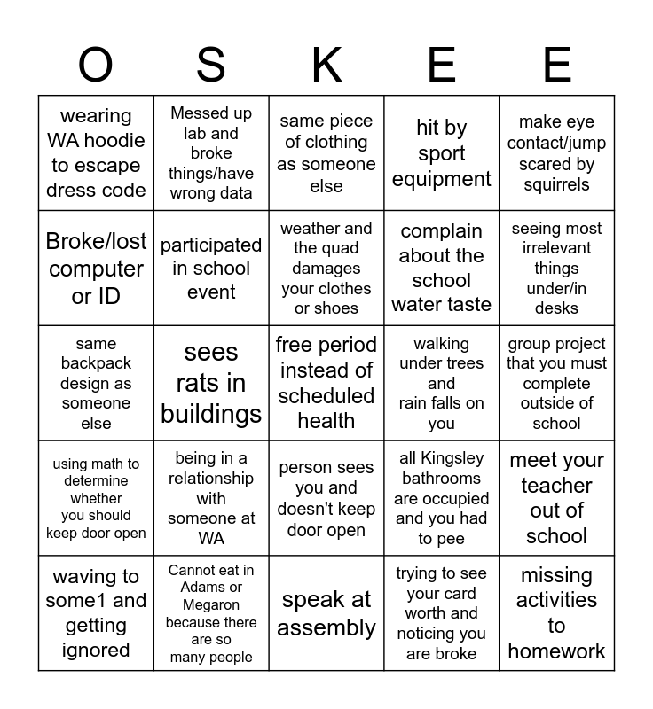 This bingo card has a free space and 49 words: wearing t-shirts as part of dress code, missing activities to homework, have art in art showcase, speak at assembly, being in a relationship with someone at WA, Ms Herlihy dress code warning, Messed up lab and broke things/have wrong data, whole school losing things email (and the thing is yours), Broke/lost computer or ID, posted on WA instagram accounts, participated in school event, hit by sport equipment, meet your teacher out of school, all Kingsley bathrooms are occupied and you had to pee, Day: must wait in dorms for ride Boarding: walking on quad randomly after 10:30 pm, Going to study at library but it is loud, weather and the quad damages your clothes or shoes, walking under trees and rain falls on you, eating takeout instead of school food, make eye contact/jump scared by squirrels, sees rats in buildings, trying to see your card worth and noticing you are broke, wearing WA hoodie to escape dress code, complain about the school water taste, Warner handset breaks when you are sitting there, seeing most irrelevant things under/in desks, waving to some1 and getting ignored, studying for classes in other classes, person sees you and doesn't keep door open, using math to determine whether you should keep door open, getting water instead of juice, walking on the quad and a car comes, Day: hearing sirens during class Boarding: hearing songs when trying to sleep, getting to play with staff pets, Cannot eat in Adams or Megaron because there are so many people, mistaking a student for someone who doesn't attend WA, not having something to do during advisory, Boarder: eat dinner in dorms instead of Adams Day: locked out of buildings after dinner, group project that you must complete outside of school, Trying to find your teacher for CCL but they are in a different classroom, incorrectly guessing someone's graduation year, Middle school friends go to WA, Siblings go to private school that is not WA, Got to have a shadow, same backpack design as someone else, same piece of clothing as someone else, trying to take the elevator but so is everyone else, Vending machine steals your money and spiders are in the WA pool.