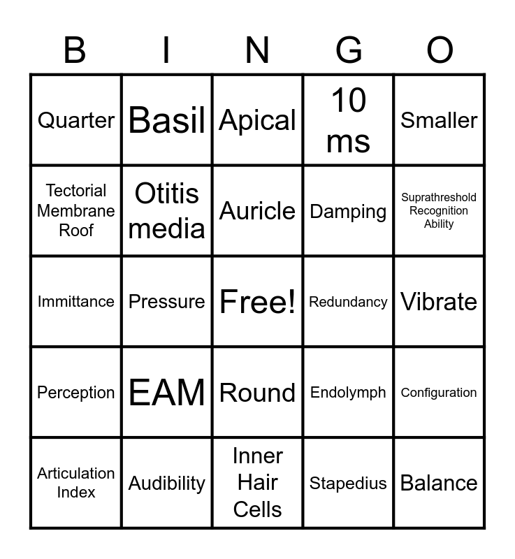 This bingo card has a free space and 27 words: Endolymph, Transducer, Damping, Inner Hair Cells, Tectorial Membrane Roof, Apical, Basil, Perception, Redundancy, Configuration, Immittance, 10 ms, Articulation Index, Audibility, Suprathreshold Recognition Ability, Profound, Otitis media, Auricle, EAM, Quarter, Vibrate, Stapedius, Pressure, Balance, Round, Smaller and Larger.