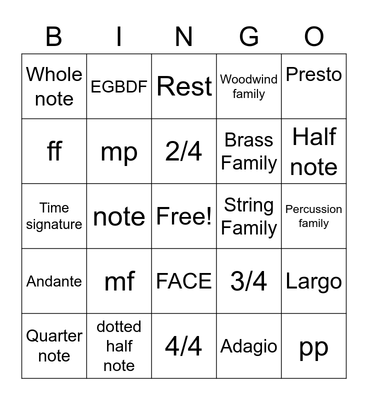 This bingo card has a free space and 24 words: mf, dotted half note, 2/4, Quarter note, Presto, Whole note, ff, EGBDF, String Family, FACE, Brass Family, Time signature, 3/4, Largo, mp, Adagio, Percussion family, Rest, Half note, note, pp, Andante, Woodwind family and 4/4.