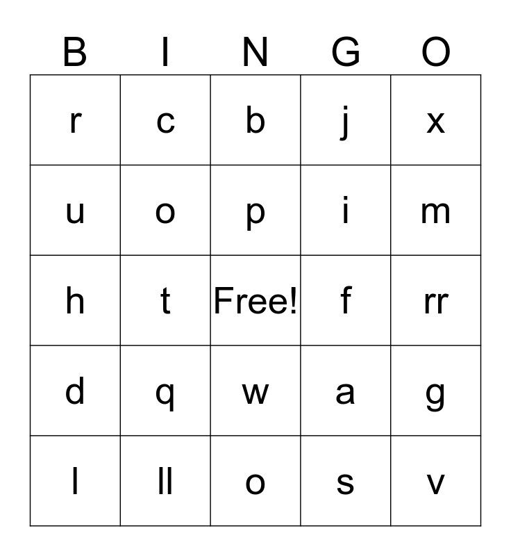 This bingo card has a free space and 27 words: a, e, i, o, u, b, c, d, f, g, h, j, l, ll, m, n, o, p, q, r, rr, s, t, v, w, x and z.
