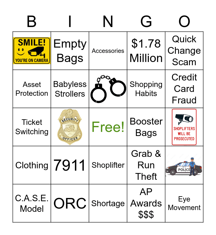 This bingo card has 5 images, a free space and 19 words: 7911, ORC, C.A.S.E. Model, Quick Change Scam, Asset Protection, Empty Bags, Booster Bags, Shoplifter, Shopping Habits, Ticket Switching, Grab & Run Theft, Babyless Strollers, AP Awards $$$, Accessories, Credit Card Fraud, Eye Movement, Clothing, $1.78 Million and Shortage.