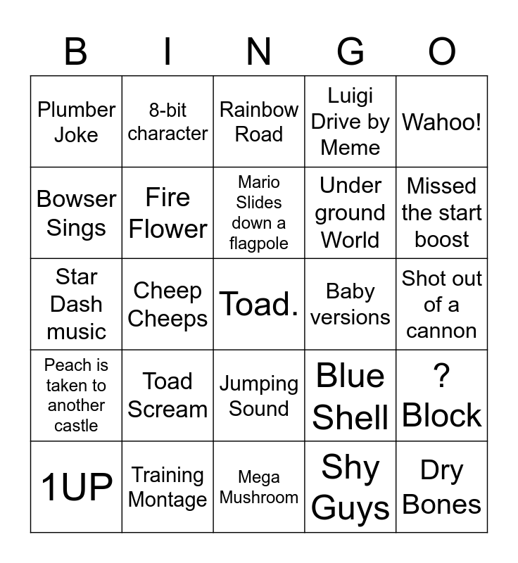 This bingo card has a free space and 24 words: Toad Scream, Training Montage, Mario Slides down a flagpole, 1UP, Wahoo!, Plumber Joke, Bowser Sings, 8-bit character, Baby versions, Jumping Sound, Under ground World, Star Dash music, Blue Shell, ? Block, Fire Flower, Shy Guys, Shot out of a cannon, Rainbow Road, Missed the start boost, Cheep Cheeps, Dry Bones, Peach is taken to another castle, Luigi Drive by Meme and Mega Mushroom.