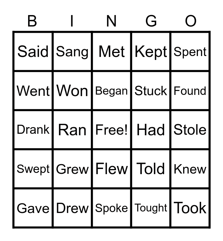 This bingo card has a free space and 24 words: Grew, Drew, Began, Gave, Spent, Said, Went, Sang, Had, Flew, Stuck, Drank, Told, Knew, Won, Tought, Stole, Met, Found, Ran, Took, Swept, Kept and Spoke.