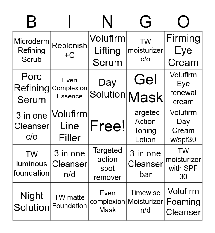 This bingo card has a free space and 25 words: 3 in one Cleanser n/d, Even complexion Mask, Day Solution, Night Solution, Firming Eye Cream, Microderm Refining Scrub, Pore Refining Serum, Replenish +C, Targeted Action Toning Lotion, Targeted action spot remover, Gel Mask, 3 in one Cleanser c/o, 3 in one Cleanser bar, TW moisturizer with SPF 30, Even Complexion Essence, Volufirm Night Cream w/retinol, Volufirm Day Cream w/spf30, Volufirm Lifting Serum, Volufirm Eye renewal cream, Volufirm Line Filler, Volufirm Foaming Cleanser, TW matte Foundation, TW luminous foundation, TW moisturizer c/o and Timewise Moisturizer n/d.