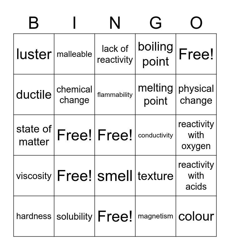 This bingo card has a free space and 24 words: Free!, solubility, flammability, hardness, Free!, luster, ductile, malleable, conductivity, smell, melting point, state of matter, texture, reactivity with acids, chemical change, magnetism, reactivity with oxygen, lack of reactivity, physical change, Free!, colour, viscosity, boiling point and Free!.