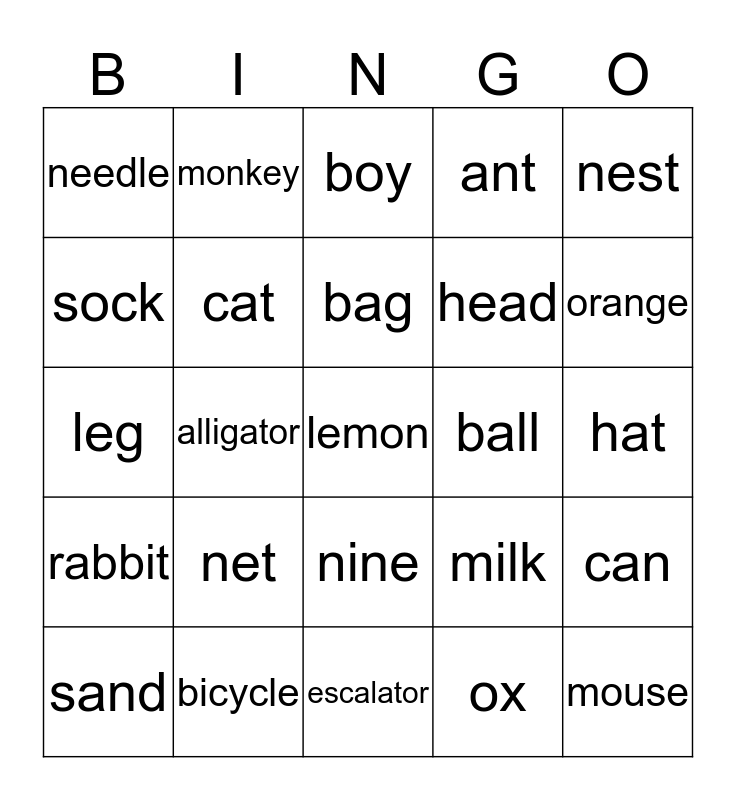 This bingo card has a free space and 24 words: net, bicycle, bag, sand, nest, needle, sock, monkey, ball, nine, head, leg, milk, can, cat, ox, hat, boy, orange, alligator, mouse, rabbit, ant and escalator.