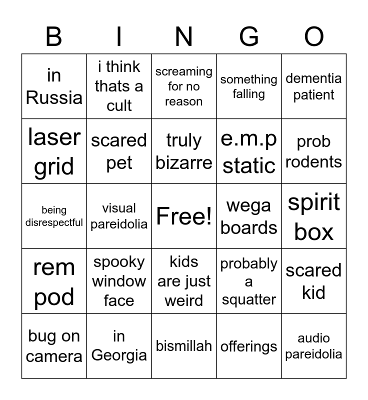 This bingo card has a free space and 38 words: bed sheet, dark corner, shaky camera, scared pet, scared kid, spooky window face, truly bizarre, shadow people, dementia patient, e.m.p static, visual pareidolia, something falling, audio pareidolia, spirit box, laser grid, rem pod, dead batteries, screaming for no reason, "spy dolls but for ghosts", wega boards, in Russia, in Georgia, prob rodents, bug on camera, spirit orbs, bismillah, clean that room, asbestos, "you decide", yelling at shadows, someone gets blind folded, kids are just weird, offerings, i think thats a cult, drugs involved, probably a squatter, being disrespectful and broken glass.
