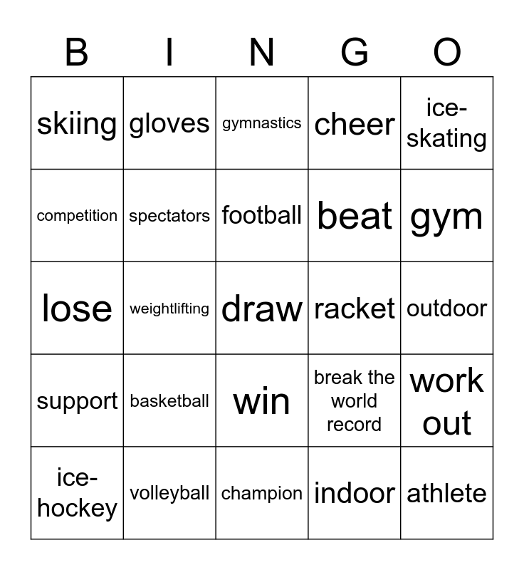 This bingo card has a free space and 24 words: basketball, volleyball, football, ice-hockey, ice-skating, skiing, competition, gloves, racket, win, beat, lose, break the world record, work out, spectators, indoor, outdoor, gymnastics, gym, weightlifting, athlete, support, cheer and champion.