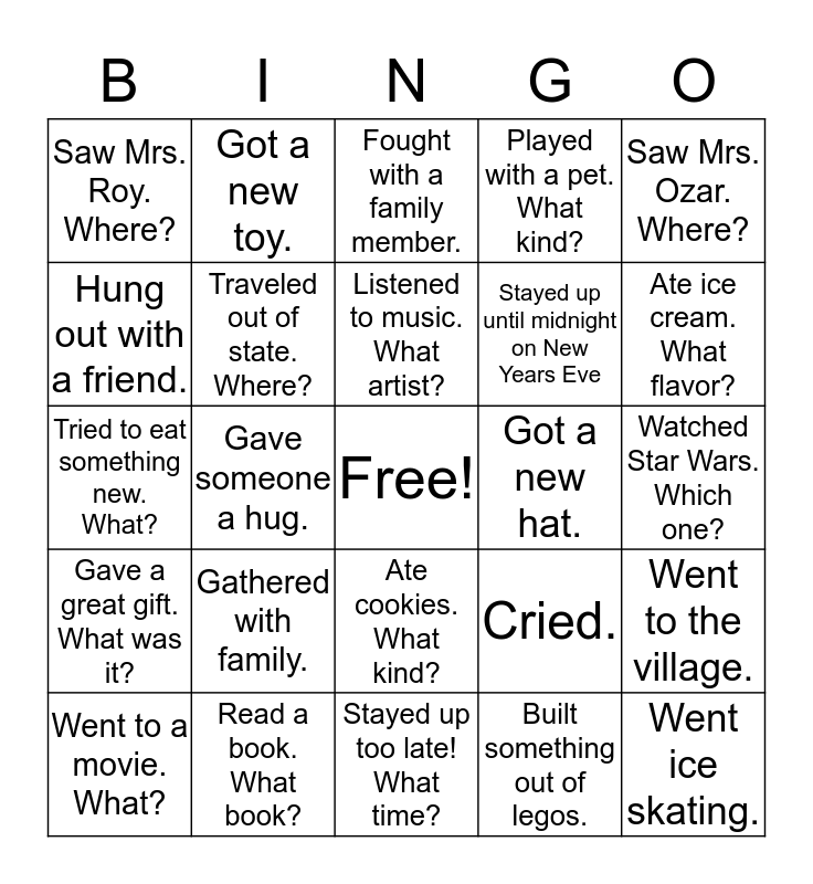 This bingo card has a free space and 24 words: Gathered with family., Read a book. What book?, Listened to music. What artist?, Went to a movie. What?, Saw Mrs. Ozar. Where?, Saw Mrs. Roy. Where?, Hung out with a friend., Got a new toy., Got a new hat., Ate cookies. What kind?, Stayed up until midnight on New Years Eve, Tried to eat something new. What?, Cried., Went to the village., Traveled out of state. Where?, Built something out of legos., Watched Star Wars. Which one?, Fought with a family member., Ate ice cream. What flavor?, Gave someone a hug., Went ice skating., Gave a great gift. What was it?, Played with a pet. What kind? and Stayed up too late! What time?.
