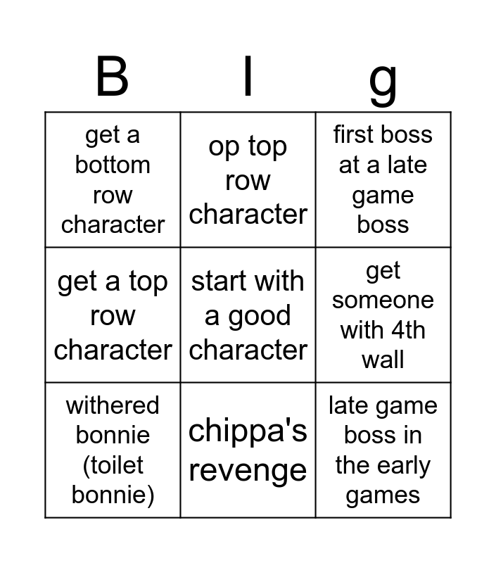 This bingo card has 12 words: scott cawthon boss, late game boss in the early games, start with a good character, get someone with 4th wall, op top row character, first boss at a late game boss, chippa's revenge, THE FUCKING RAINBOW, get a bottom row character, get a top row character, withered bonnie (toilet bonnie) and coffee.