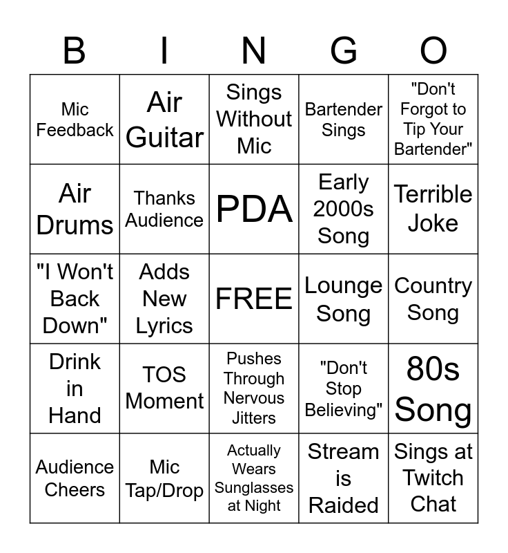 This bingo card has a free space and 65 words: No Show (Person Skipped), Same Artist Back to Back, Raps, 80s Song, 70s Song, Duet, Air Guitar, 90s Song, PDA, 3+ singers, Pushes Through Nervous Jitters, DJ Sings, Country Song, "Don't Forgot to Tip Your Bartender", 60s Song, Air Drums, Adds New Lyrics, Mic Feedback, Wrong Lyrics, Early 2000s Song, TOS Moment, Drink in Hand, Bartender Sings, "Baby Got Back", Clearly Drunk, Dances, Girl/Boy Band Song, Disney Song, Sings at Twitch Chat, Points/Waves at Camera, Audience Cheers, "Where's this place?" Someone in Chat Asks, Sings in Back to Back Songs, DJ Reads Comment in Chat, "Don't Stop Believing", Mic Tap/Drop, Punk Song, "I Won't Back Down", Stream is Raided, Laughs, Thanks Audience, Viewer Tips (Subs, Bits, Dono, etc), Lounge Song, Devil Horns (Hand Gesture), Waves Hands, Claps, Terrible Joke, Takes Selfie, "My Way", Mumbles, Yells, Weird Al Did Parody of This, Takes Off Cloths (Hat, Jacket, Shirt, etc), Actually Wears Sunglasses at Night, Comments About Messing Up, Wrong Song, Mic Muted, Sings Without Mic, Pearl Jam Song, Billy Joel Song, Elton John Song, Phil Collins Song, ABBA Song, Snaps Fingers and Gets Audience to Participate.