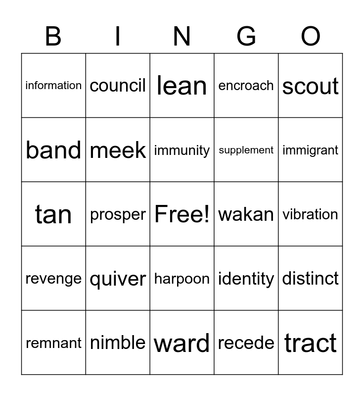 This bingo card has a free space and 24 words: quiver, nimble, immunity, remnant, scout, information, band, council, wakan, harpoon, supplement, tan, identity, distinct, meek, recede, vibration, lean, immigrant, prosper, tract, revenge, encroach and ward.