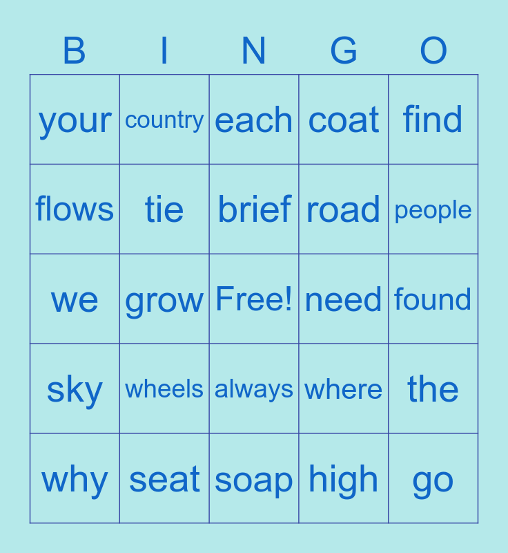 This bingo card has a free space and 34 words: bright, high, pies, child, sky, tie, find, why, country, again, brief, each, field, fleas, need, people, seat, we, wheels, where, always, know, your, found, soap, go, coat, no, road, flows, show, grow, the and stop.