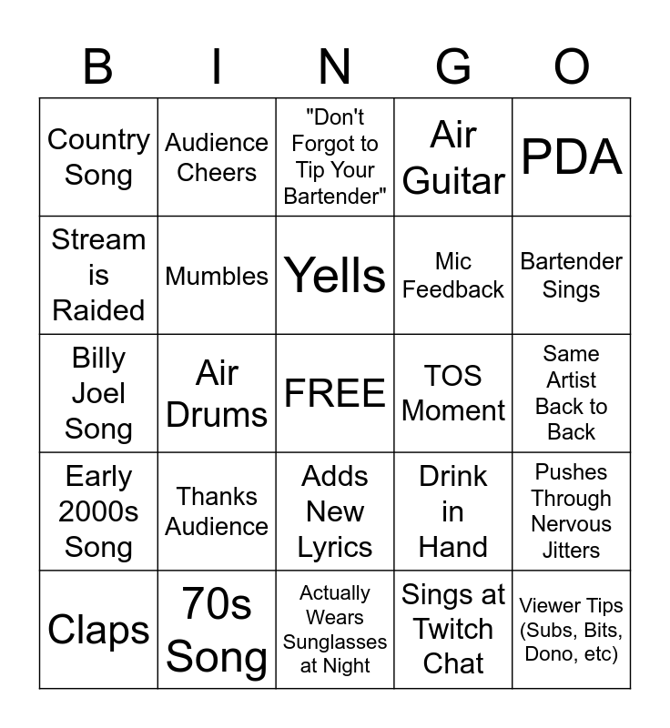 This bingo card has a free space and 69 words: No Show (Person Skipped), Same Artist Back to Back, Raps, 80s Song, 70s Song, Duet, Air Guitar, 90s Song, PDA, 3+ singers, Pushes Through Nervous Jitters, DJ Sings, Country Song, "Don't Forgot to Tip Your Bartender", 60s Song, Air Drums, Adds New Lyrics, Mic Feedback, Wrong Lyrics, Early 2000s Song, TOS Moment, Drink in Hand, Bartender Sings, "Baby Got Back", Clearly Drunk, Dances, Girl/Boy Band Song, Disney Song, Sings at Twitch Chat, Points/Waves at Camera, Audience Cheers, "Where's this place?" Someone in Chat Asks, Sings in Back to Back Songs, DJ Reads Comment in Chat, "Don't Stop Believing", Mic Tap/Drop, Punk Song, "I Won't Back Down", Stream is Raided, Laughs, Thanks Audience, Viewer Tips (Subs, Bits, Dono, etc), Lounge Song, Devil Horns (Hand Gesture), Waves Hands, Claps, Terrible Joke, Takes Selfie, "My Way", Mumbles, Yells, Weird Al Did a Parody of This, Takes Off Cloths (Hat, Jacket, Shirt, etc), Actually Wears Sunglasses at Night, Comments About Messing Up, Wrong Song, Singer Turns on Mic, Sings Without Mic, Pearl Jam Song, Billy Joel Song, Elton John Song, Phil Collins Song, ABBA Song, Snaps Fingers, Audience Sings Along, Waves Cellphone Light, Has a cocktail, Has a bottle drink and Adds a Dirty Word.