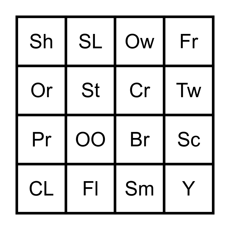 This bingo card has 16 words: Fl, Sc, Ow, Sh, Pr, SL, Br, Sm, Or, St, CL, Fr, OO, Tw, Cr and Y.