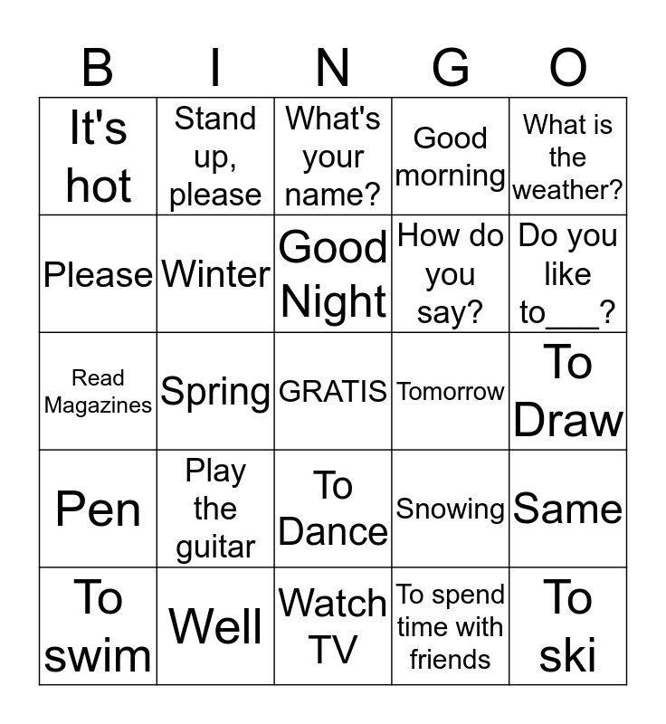 This bingo card has a free space and 24 words: Play the guitar, Well, Good Night, To swim, What is the weather?, It's hot, Please, Stand up, please, Tomorrow, To Dance, How do you say?, Read Magazines, Snowing, Same, Winter, To spend time with friends, To Draw, What's your name?, Do you like to___?, Spring, To ski, Pen, Good morning and Watch TV.