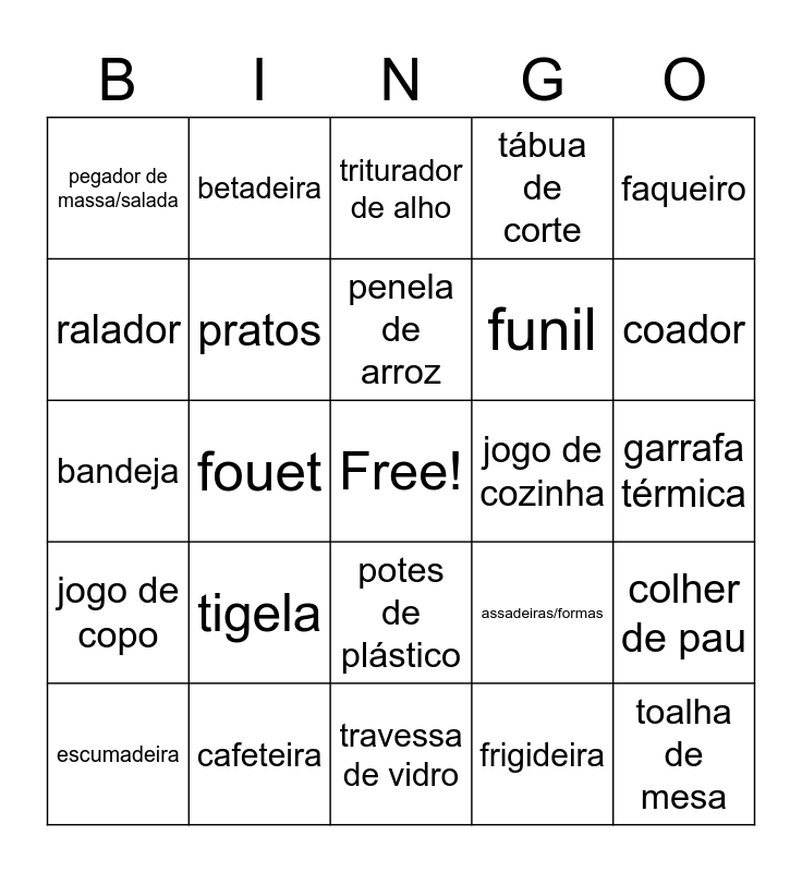 This bingo card has a free space and 34 words: Panela, frigideira, faca, jarra de vidro, jogo de copo, pratos, faqueiro, escumadeira, betadeira, liquidificador, penela de arroz, triturador de alho, espremedor de frutas, jogo de sobremesa, jogo de cozinha, coador, cafeteira, bandeja, tigela, assadeiras/formas, potes de plástico, escorredor de macarrão, pegador de massa/salada, garrafa térmica, travessa de vidro, toalha de mesa, tábua de corte, peneira, funil, ralador, canecão, fouet, colher de pau and panela de pressão.