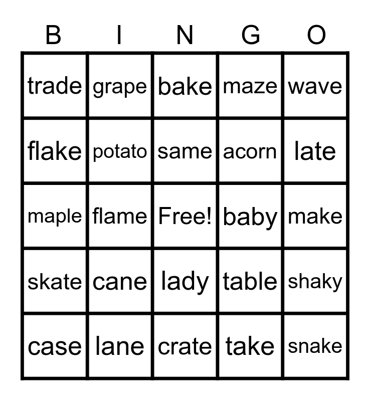 This bingo card has a free space and 24 words: cane, lane, same, case, wave, trade, flake, grape, baby, lady, acorn, maple, table, shaky, potato, take, make, bake, late, flame, snake, skate, maze and crate.