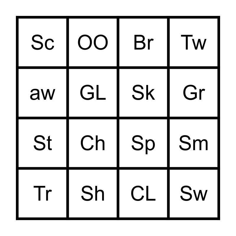 This bingo card has 16 words: Sh, Sm, Br, Sc, St, OO, Sp, CL, aw, GL, Tr, Tw, Ch, Gr, Sk and Sw.