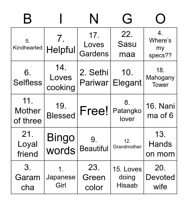This bingo card has a free space and 24 words: Bingo words, 1. Japanese Girl, 2. Sethi Pariwar, 3. Garam cha, 4. Where’s my specs??, 5. Kindhearted, 6. Selfless, 7. Helpful, 8. Patangko lover, 9. Beautiful, 10. Elegant, 11. Mother of three, 12. Grandmother, 13. Hands on mom, 14. Loves cooking, 15. Loves doing Hisaab, 16. Nani ma of 6, 17. Loves Gardens, 18. Mahogany Tower, 19. Blessed, 20. Devoted wife, 21. Loyal friend, 22. Sasu maa and 23. Green color.