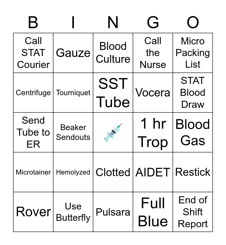 This bingo card has a free space and 24 words: Hemolyzed, Use Butterfly, SST Tube, Rover, Micro Packing List, Call STAT Courier, Centrifuge, Gauze, 1 hr Trop, Clotted, Vocera, Send Tube to ER, AIDET, Restick, Tourniquet, Full Blue, Blood Gas, Blood Culture, STAT Blood Draw, Beaker Sendouts, End of Shift Report, Microtainer, Call the Nurse and Pulsara.