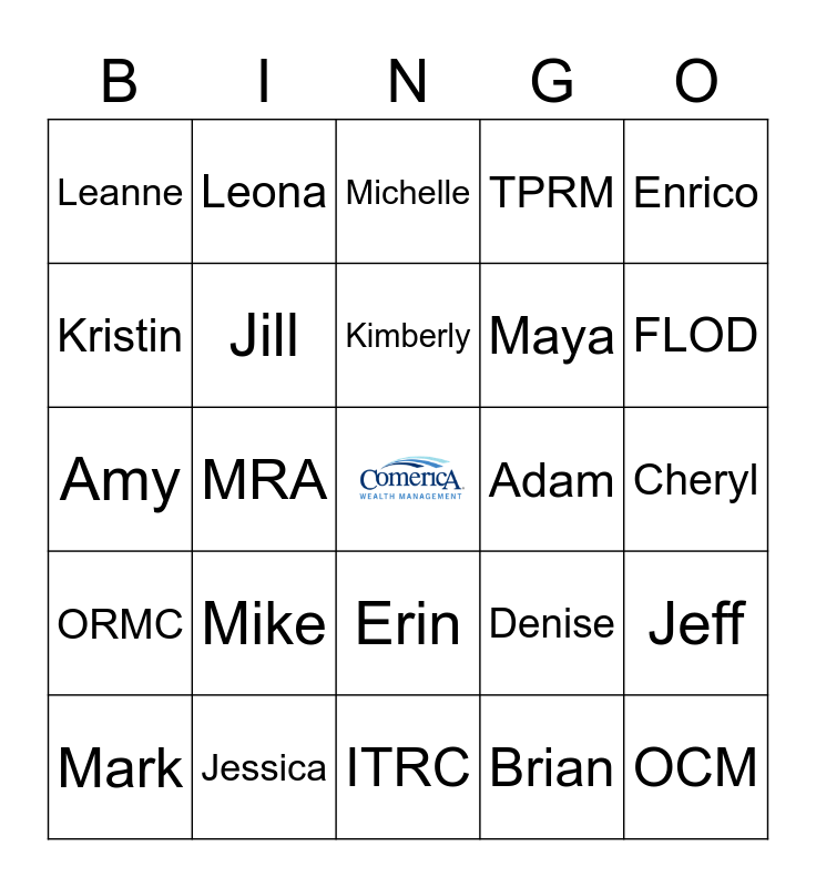 This bingo card has a free space and 24 words: Mike, Jessica, Kimberly, Mark, Enrico, Leanne, Kristin, Leona, Adam, Erin, Maya, Amy, Denise, Jeff, Jill, Brian, Cheryl, Michelle, FLOD, MRA, OCM, ORMC, TPRM and ITRC.