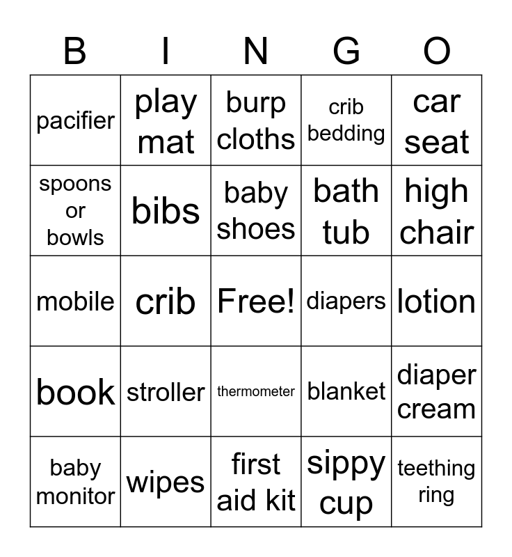 This bingo card has a free space and 36 words: boppy pillow, baby powder, baby socks, bibs, blanket, book, baby shoes, bottle, car seat, bouncer, crib, crib bedding, diaper bag, diapers, high chair, pacifier, rattle, stroller, teething ring, burp cloths, lotion, diaper cream, wipes, baby monitor, first aid kit, play mat, mobile, towels, bath tub, spoons or bowls, onesie, hat, sippy cup, thermometer, laundry supplies and photo book.