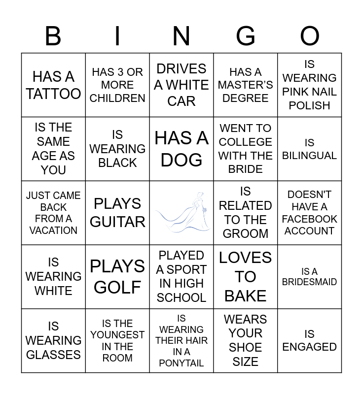 This bingo card has a free space and 42 words: HAS BEEN MARRIED 10+ YEARS, HAS A DOG, WEARS CONTACT LENSES, PLAYS GOLF, WEARS YOUR SHOE SIZE, IS A BRIDESMAID, IS ENGAGED, DOESN'T DRINK COFFEE, DRIVES A WHITE CAR, PLAYED A SPORT IN HIGH SCHOOL, DOESN'T HAVE A FACEBOOK ACCOUNT, IS BILINGUAL, PLAYS GUITAR, IS WEARING PINK NAIL POLISH, IS FROM OUT OF STATE, LOVES TO BAKE, IS RELATED TO THE BRIDE, JUST CAME BACK FROM A VACATION, IS WEARING SOMETHING BLUE, HAS 3 OR MORE CHILDREN, IS THE SAME AGE AS YOU, IS LEFT HANDED, MARRIED IN THE LAST YEAR, HAS A TATTOO, HAS BEEN MARRIED LESS THAN 1 YEAR, HAS A CAT, WENT TO COLLEGE WITH THE BRIDE, WENT TO HIGH SCHOOL WITH THE BRIDE, ORDERED FROM AMAZON TODAY, IS A BUSINESS OWNER, TRAVELED 1+ HOUR TO GET HERE, IS WEARING WHITE, IS WEARING BLACK, IS WEARING THEIR HAIR IN A PONYTAIL, HAS A TIK TOK, IS WEARING GLASSES, IS THE YOUNGEST IN THE ROOM, IS RELATED TO THE GROOM, IS LEFTHANDED, HAS LIPSTICK IN THEIR PURSE, HAS A MASTER’S DEGREE and PLAYS A MUSICAL INSTRUMENT.