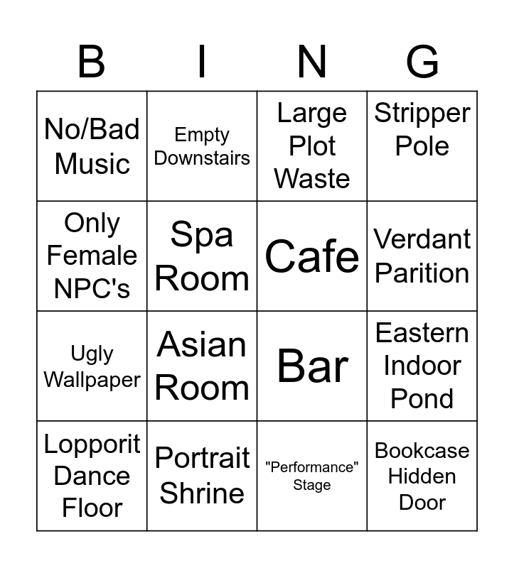 This bingo card has 16 words: Portrait Shrine, Eastern Indoor Pond, Large Plot Waste, No/Bad Music, Ugly Wallpaper, Empty Downstairs, Bar, "Performance" Stage, Only Female NPC's, Spa Room, Lopporit Dance Floor, Stripper Pole, Asian Room, Verdant Parition, Cafe and Bookcase Hidden Door.