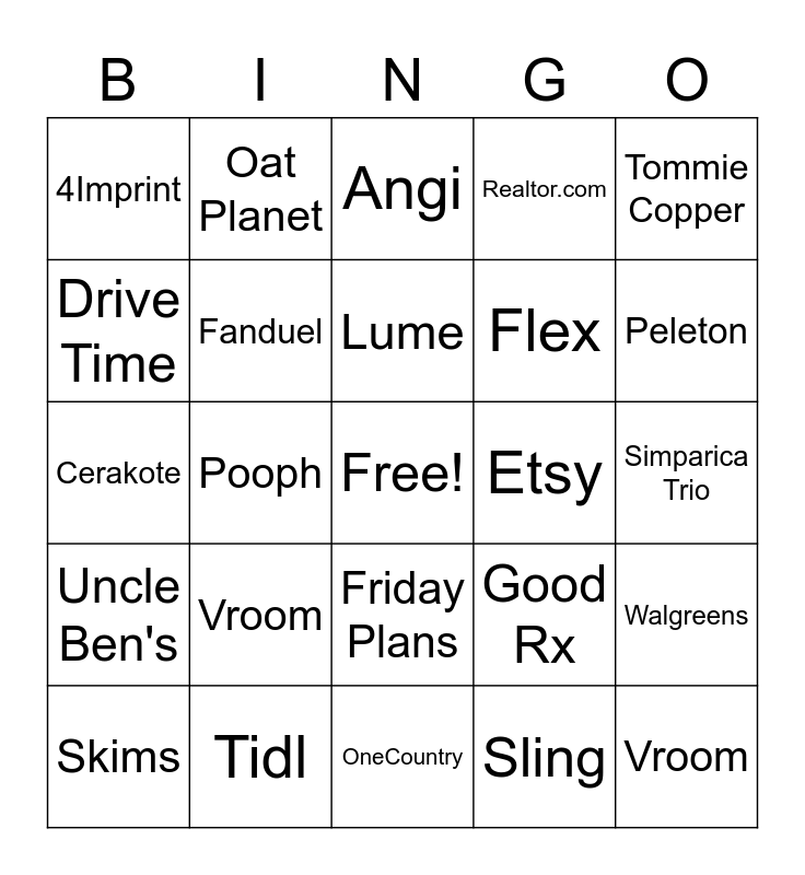 This bingo card has a free space and 24 words: Vroom, Tidl, Lume, Skims, Tommie Copper, 4Imprint, Drive Time, Oat Planet, Etsy, Friday Plans, Flex, Cerakote, Good Rx, Walgreens, Fanduel, Sling, Simparica Trio, Angi, Peleton, Pooph, Vroom, Uncle Ben's, Realtor.com and OneCountry.